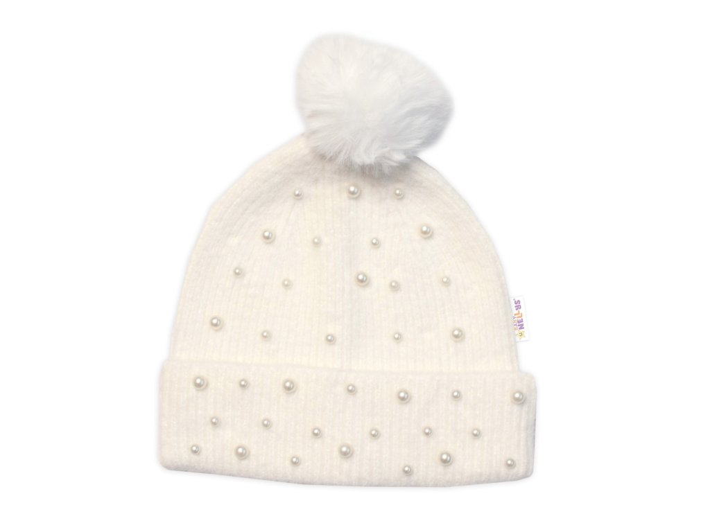 Zimní čepice s bambulí + šál, Pearls, Baby Nellys - smetanová, vel. 54/58
