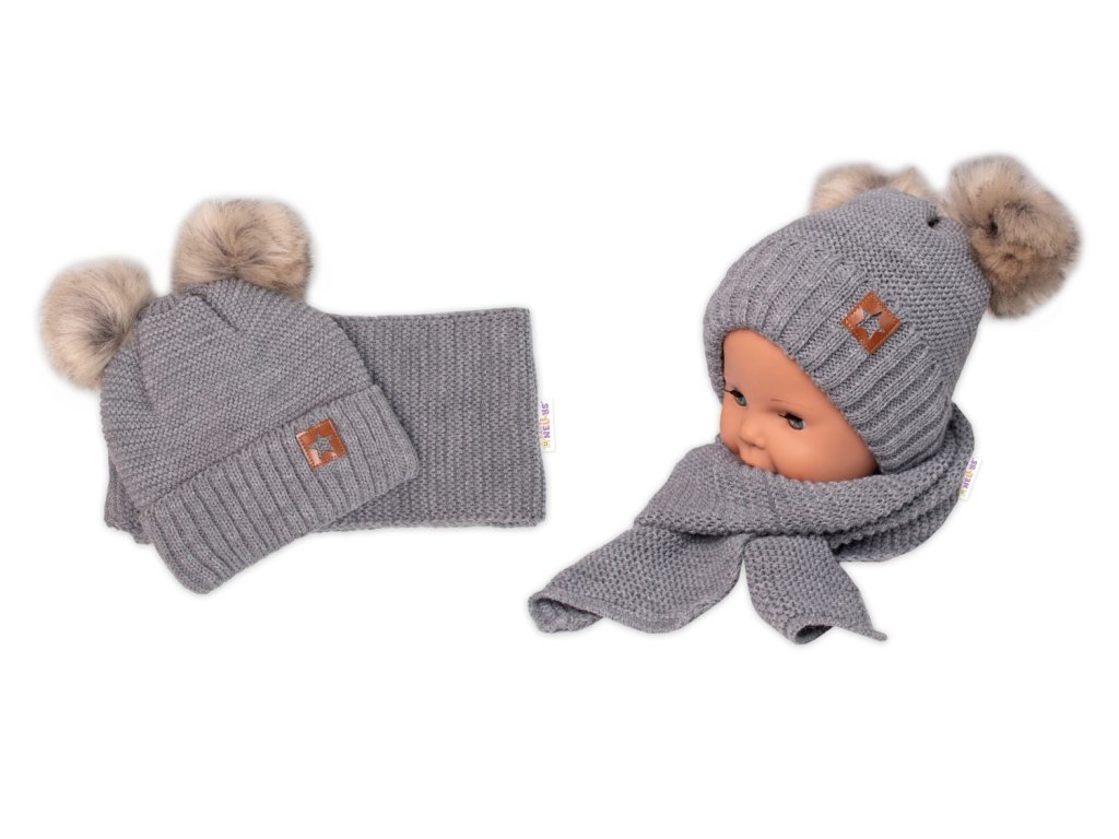 Zimní čepice s kožešinovými bambulemi + šál Baby Nellys Star - šedá, 6/24 měsíců