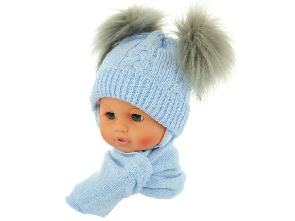 Zimní čepička s šálou - chlupáčkové bambulky - sv. modrá