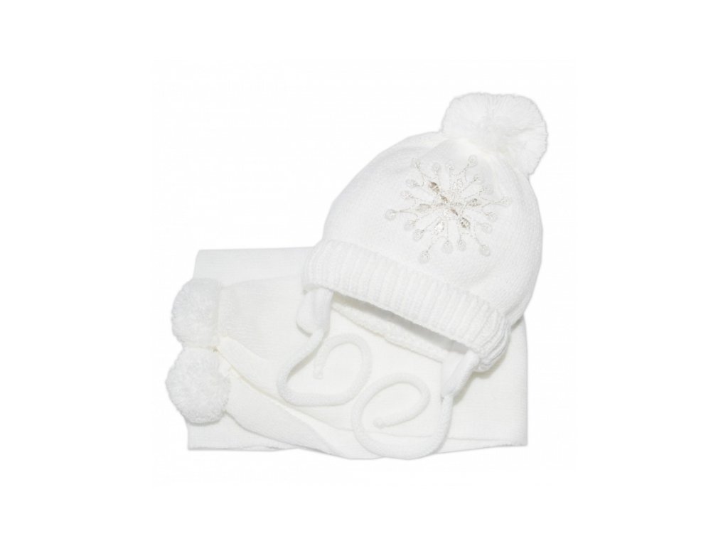 Zimní čepička s šálou - Sněhová vločka v bílé, 0-6m