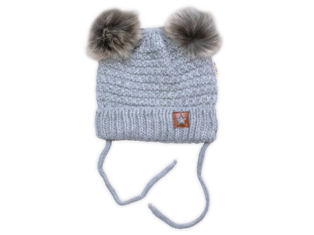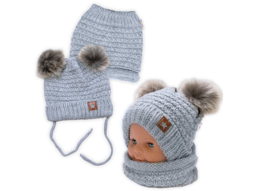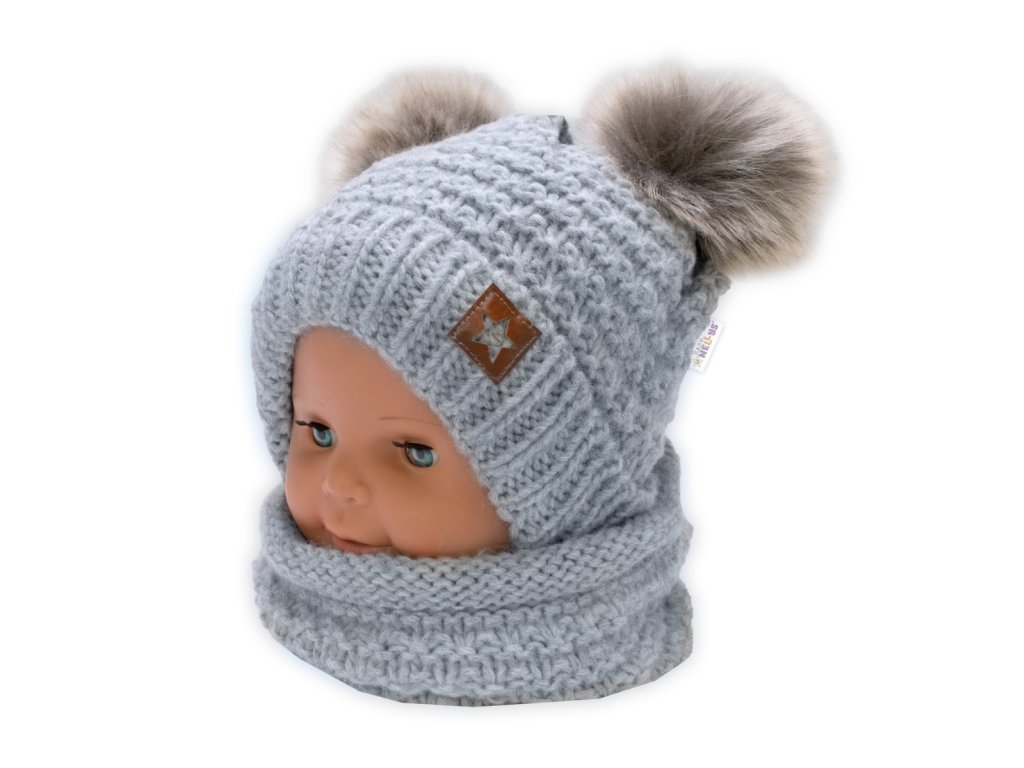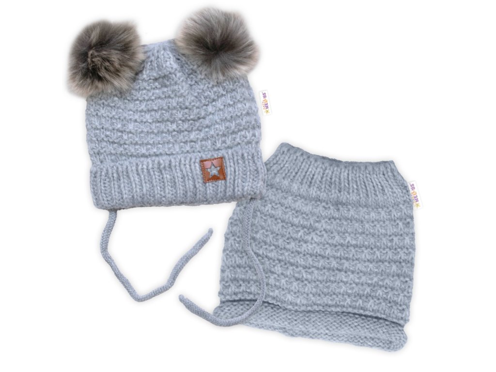 Zimní pletená čepice Star s fleecem a chlupáčkové bambulky+komínek 2D sada, šedý melírek
