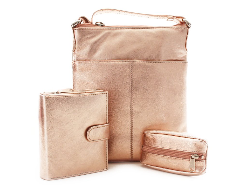 Luxusní zlatorůžová sada z pravé kůže představuje elegantní a praktické řešení pro ženy, které oceňují styl i funkčnost. Set obsahuje dámskou kabelku, peněženku a klíčenku – dokonale sladěné doplňky v moderním metalickém odstínu.